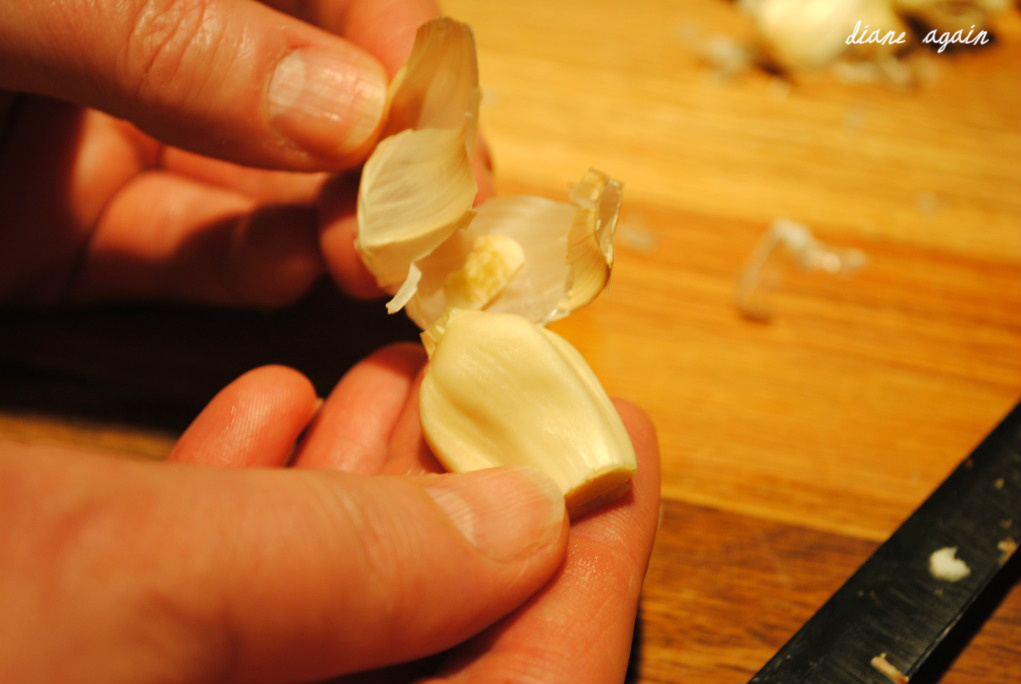 | Garlic burns easily so we saved it till the very end. Some of my cloves were much bigger than others, so I chopped a few of the giants in half, to create more uniform sizes. |