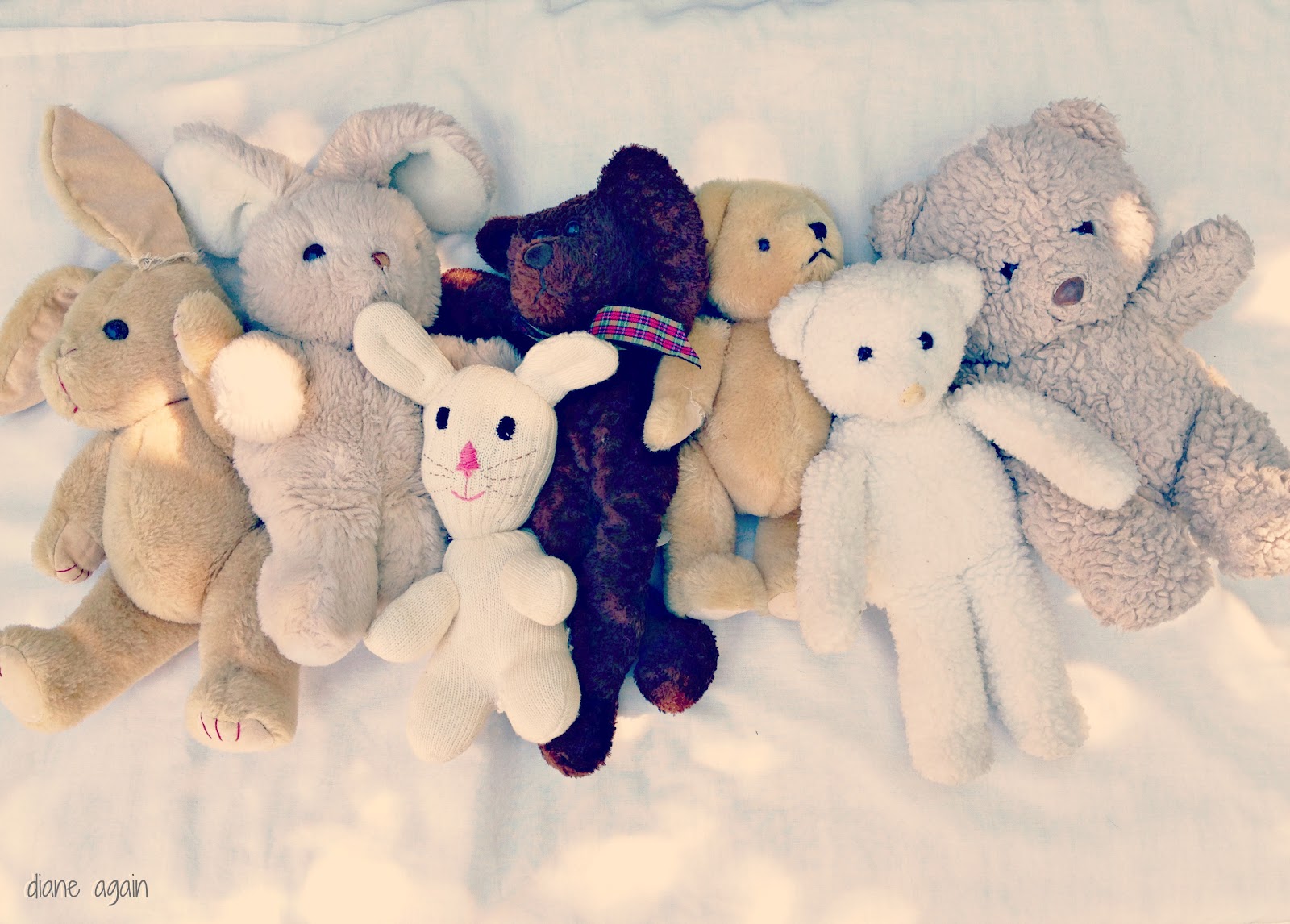 Next comes one of my most fiercely edited collections. Over the years, approximately one billion stuffed animals have come into this home and lived among us. The vast majority of them are gone from us now, but my daughters have each adopted a few special ones, and these are the ones I loved most. I seem to be drawn to bunnies and bears in shades of brown and white. Each one tells a sweet story and appeals to me on its own, but as a group, I find their charm to be exponentially multiplied.